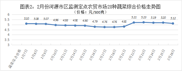 二、蔬菜价格上涨。连续降雨降温天气,不利于蔬菜的种植和生长,产能偏低,蔬菜运输也受一定的影响。市区28个蔬菜品种月均综合价格5元,环比涨16.01%,月均综合价格呈上涨态势(图表2)。环比涨幅较大的蔬菜品种有:本地菜心5.16元、上海青3.98元、生菜3.89元、大白菜3.16元、菠菜6.11元,环比价格分别涨40.22%、26.75%、37.94%、19.25%、20.99%。随着天气回暖,有利于蔬菜的生产和运输,预计3月蔬菜价格将会逐步回落。
