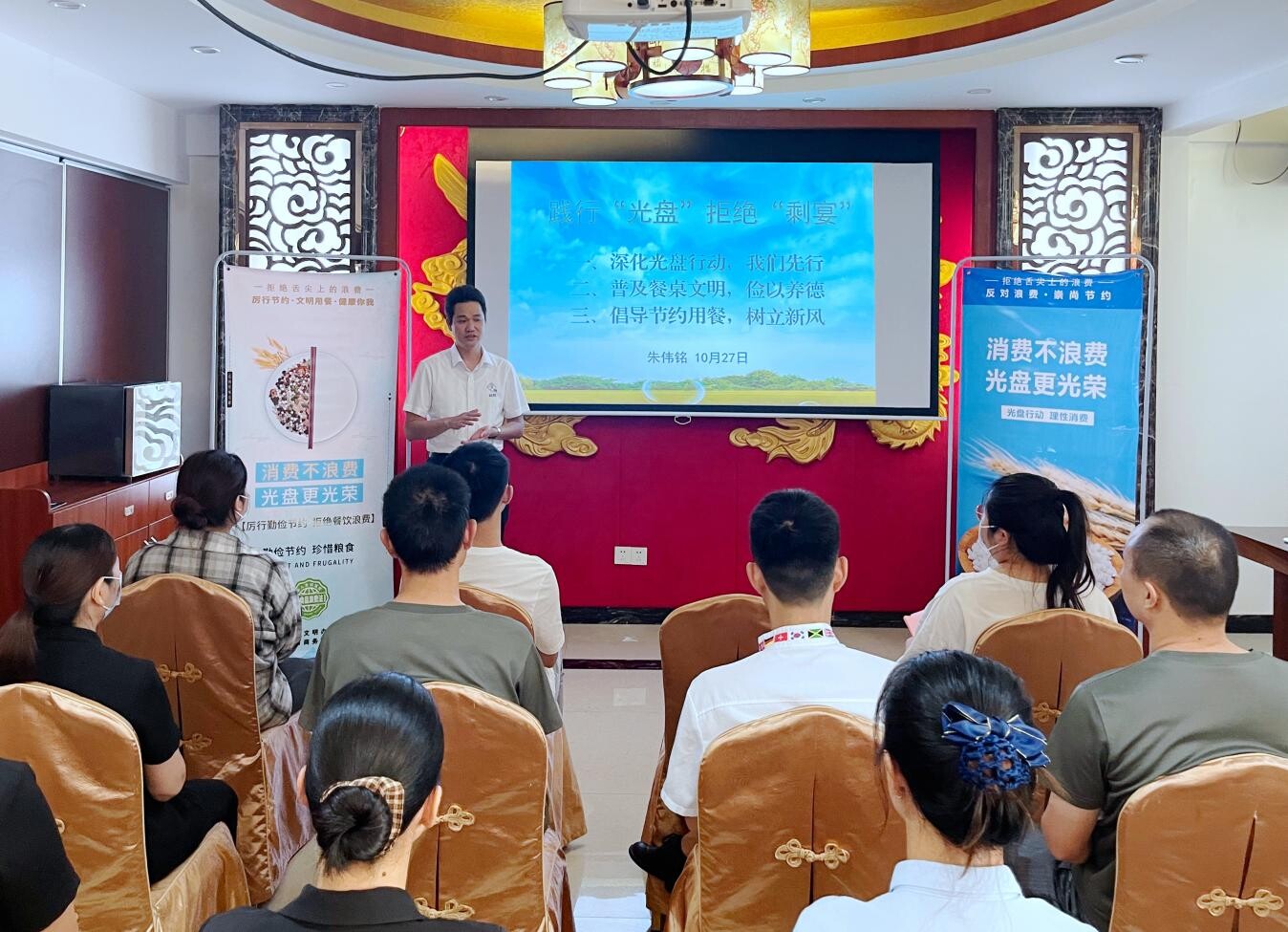 此次活动邀请了河源技师学院烹饪专业客座教授朱伟铭宣讲,主题为“践行光盘 拒绝剩宴”,涵盖深化“光盘行动”、普及餐桌文明知识、倡导节约用餐等内容,并呼吁各餐饮企业加入到“光盘行动”行列中,将制止餐饮浪费贯穿到采购、制作、用餐全过程,引导消费者适量点餐,为制止餐饮浪费贡献一份力量。活动现场发放倡议书30多份、张贴宣传海报20多份,市商务局、源城区工商信局相关负责同志,餐饮企业代表约30人参加活动。