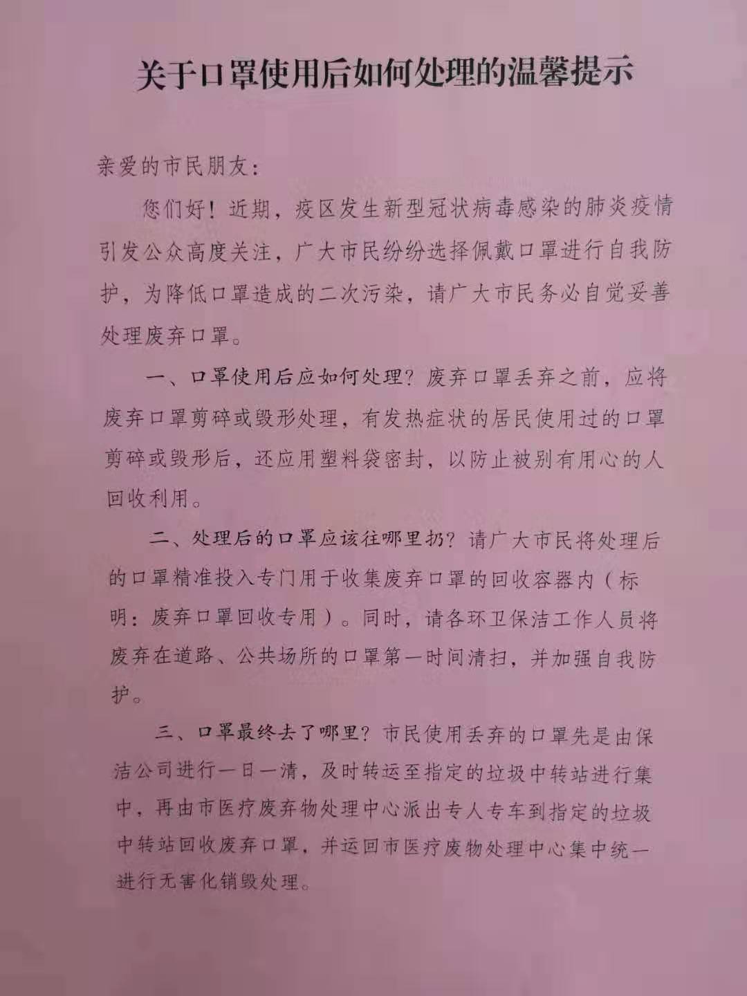 市住建局有关负责人也呼吁广大市民,要自觉妥善处理废弃口罩。废弃口罩丢弃之前,应将废弃口罩剪碎或毁形处理,有发热症状的居民使用过的口罩剪碎或毁形后,还应用塑料袋密封,以防止被别有用心的人回收利用。