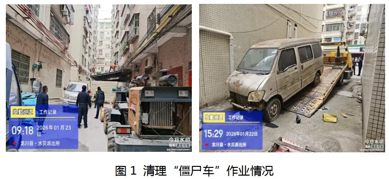 2025年12月以来,龙川县城管综合执法局陆续接到该楼栋居民多次投诉,反映楼栋后侧存在违法搭建构筑物,且有“僵尸车辆”长期停放,占用消防通道,既影响居民日常出行,更严重阻碍应急逃生和消防救援,存在极大安全风险,群众反映强烈、诉求迫切。