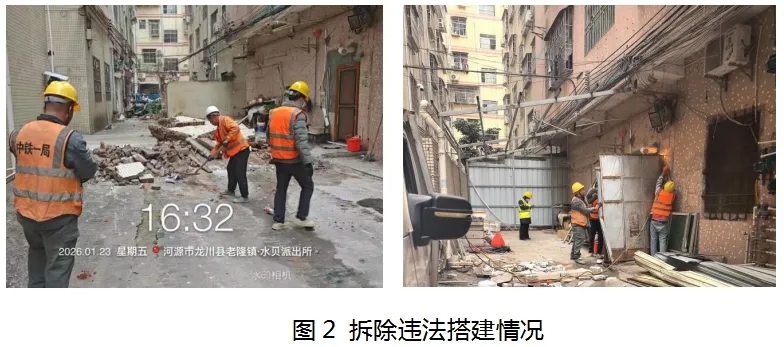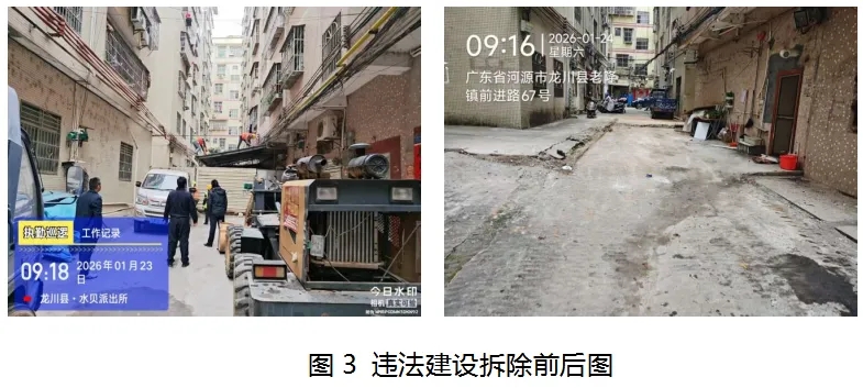 1月23日,龙川县城管综合执法局联合交警部门依法对该处违法搭建实施拆除,拆除面积约80平方米,并对占用消防通道的“僵尸车辆”予以强制拖移,彻底打通“生命通道”,从源头消除安全隐患,以务实举措回应群众期盼、维护社会公平正义。