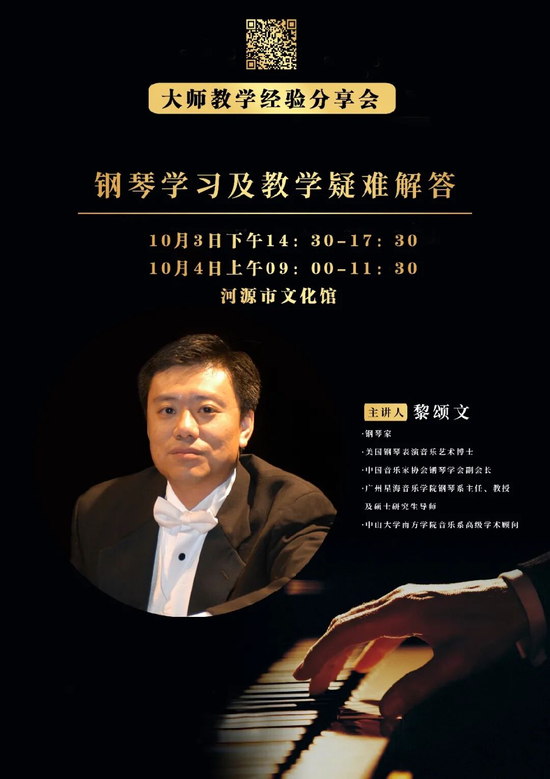 10月3日,黎颂文教授将应邀河源市文化馆为乐迷们献上一台钢琴教学分享会。10月4日,市文化馆特别策划了一场钢琴大师班,为大家提供一次近距离接触大师,观摩交流、学习提高的机会。