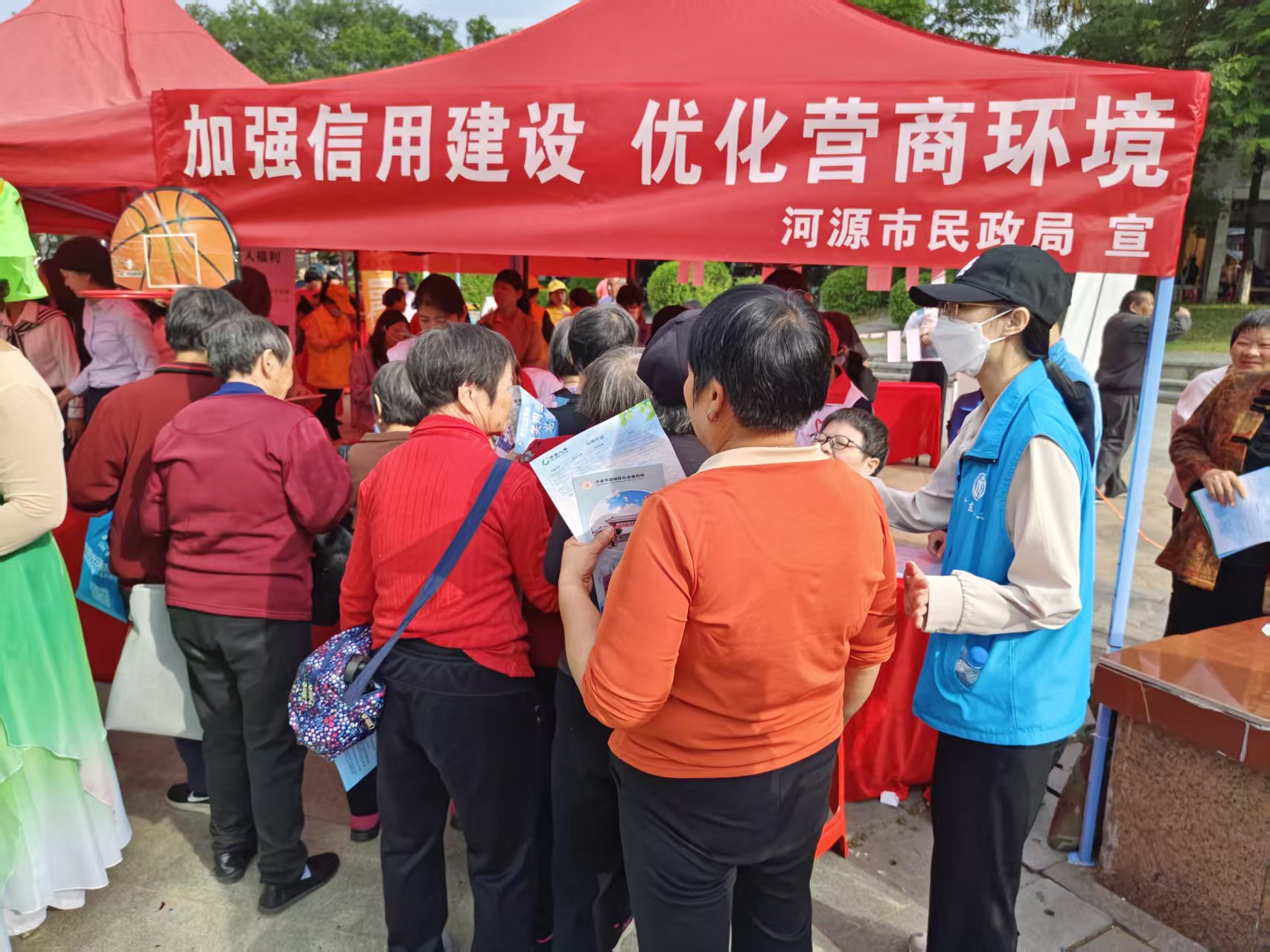 活动现场工作人员通过派发宣传单张、政策解读、有奖问答等形式,宣传《社会组织信用建设和管理规范》《社会组织反恐怖融资管理办法》和养老诈骗等案例及政策,为社会组织从业人员和市民群众深入介绍民政领域相关信用建设管理制度和应用。